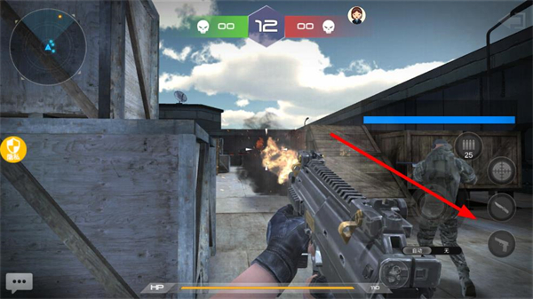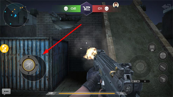 1、左侧虚拟摇杆控制移动,可灵活走位寻找掩体,如集装箱、砖墙后都可作为掩护,避免被敌方持续攻击。