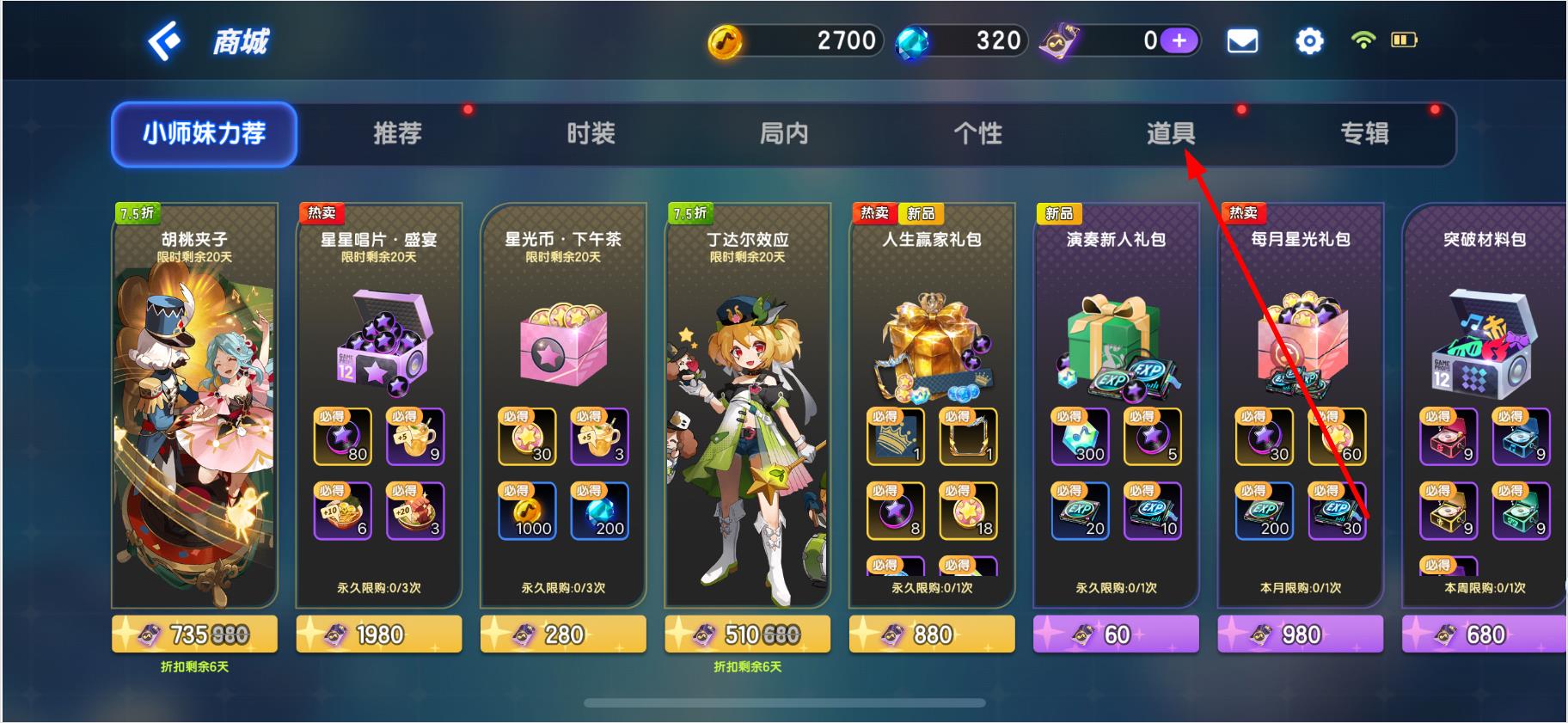 2、在商店页面,点击顶部的道具选项卡。
