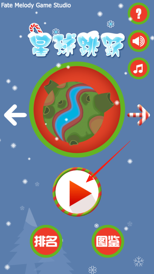 1、进入星球跳跃游戏主界面,想开始冒险就点中间红色三角按钮,画面里还有排名图鉴能看,不过先玩起来,操控角色在星球间跳跃闯关才有意思。
