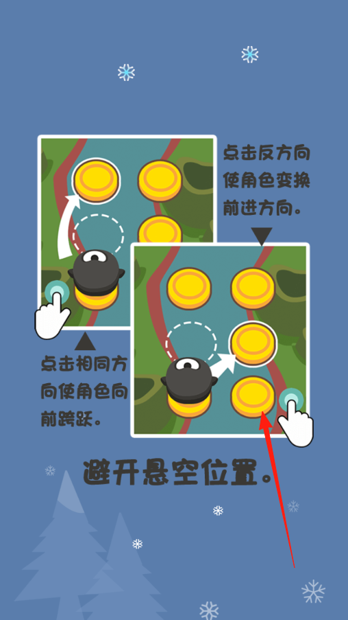2、游戏开局有操作教学,得记住两种点击方式,点相同方向让角色往前跳,点反方向能切换前进方向,跟着提示多练练,避开悬空位置,别让角色掉下去。