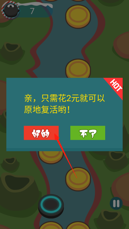 3、要是闯关时角色掉下去失败了,会弹出复活提示,想花2元原地复活接着玩,就点好的,要是想重新开始挑战,选不了就行,看自己心情决定咋继续游戏。