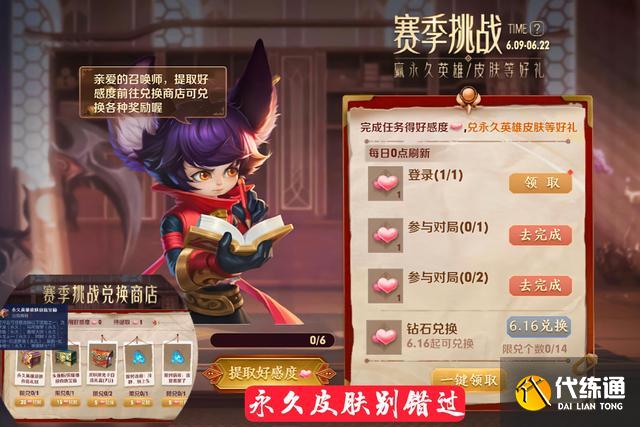 另外在今天的时候,还有一个赛季挑战的任务已经上架到王者荣耀中,这个活动也是非常的简单,只需要玩家每天登陆游戏完成两局游戏,这样的话就可以领取到好感度,利用好感度还可以兑换免费皮肤,而且这一次的奖池看起来还是挺不错的,除了免费的皮肤之外,还可以兑换限时语音,两款皮肤还是限定级的活动专属,错过还是非常亏的,大家尽量完成任务,因为一款皮肤需要25个好感度才能兑换。